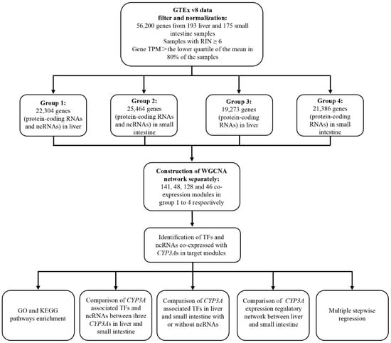 In this study, we conducted a weighted gene co-expression network analysis to identify TFs and ncRNAs associated with CYP3As in the liver and small intestine based on GTEx v8 data. The expression data were analyzed with and without ncRNAs in both the liver and small intestine. Bioinformatic databases were applied to further prioritize TFs and ncRNAs using multiple stepwise regression analysis to identify TFs and ncRNAs contributing to CYP3A expression in the liver and small intestine. Networks obtained with CYP3As and TFs alone are similar to those published earlier, and a series of previously reported TFs related to CYP3A, such as ESR1, HNF4α, and NR1I2, were also identified here [,,]. Including ncRNAs with the analysis yielded an expanded set of TFs and multiple significant lncRNAs affecting CYP3A expression.