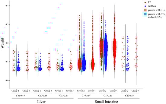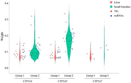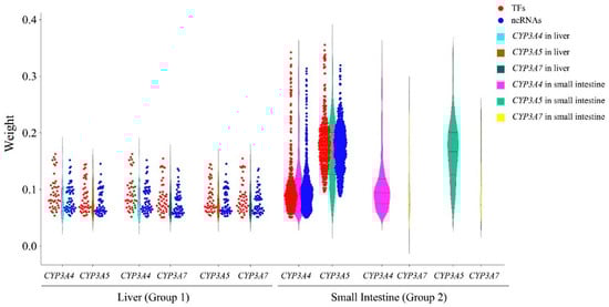 To compare CYP3A-associated TFs and ncRNAs in the liver and small intestine, TFs and ncRNAs associated with each CYP3A with a weight value greater than 0.05 from groups 1 and 2 were selected. As shown in Supplementary Table S6 and Figure 6, most TFs and ncRNAs differ between the liver and small intestines for each CYP3A. CYP3A4 and 3A5 are associated with more TFs and ncRNAs in the small intestines than in the liver. In addition, the average weight values of TFs and ncRNAs associated with CYP3As in the small intestine were higher than that in liver. These results indicate that different TFs and ncRNAs are involved in the regulatory modes of CYP3A expression in the liver and small intestine.