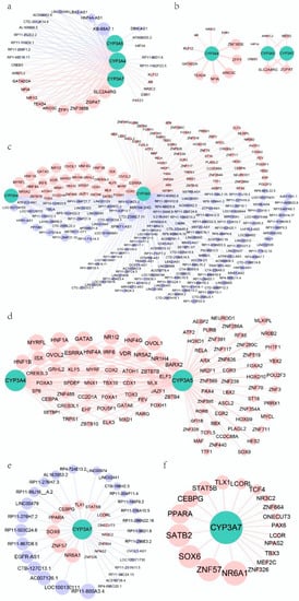 The direct co-expression relationships among TFs, lncRNAs, and CYP3A4, 3A5, and 3A7. (a) The co-expression network of TFs, ncRNAs, and CYP3As in group 1 and all TFs and ncRNAs with weight values > 0.1. (b) The co-expression network in group 3 (weight value > 0.1). (c) The co-expression network of TFs, ncRNAs, CYP3A4, and 3A5 in group 2. (d) The co-expression network of TFs, CYP3A4, and 3A5 in group 4 (weight value > 0.2). (e) The co-expression network of TFs, ncRNAs, and CYP3A7 in group 2. (f) The co-expression network of TFs and CYP3A7 in group 4 (weight value > 0.1). The thicker the edges in (a,b), the larger the weight values. The larger the dots in (a–f), the larger the weight values. The size of dots represents weight value with CYP3A5 when there is more than one relationship among TFs, ncRNAs, and CYP3As. The red and blue dots represent TFs and ncRNAs, respectively.