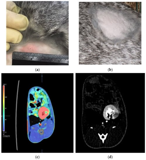 All challenged animals developed a specific inflammatory process in the kidneys with a characteristic immunological reorganization, which was confirmed by erythema of 15.3 ± 2.8 mm in size in response to Diaskintest® administration 18 days after the challenge and its absence (Figure 2a,b, respectively). According to the results of the abdominal computed tomography scan 30 days after the challenge, a clearly defined area of reduced perfusion was revealed in the left (infected) kidney (Figure 2c). During standard computed tomography, a destruction focus is visualized in this area (Figure 2d).