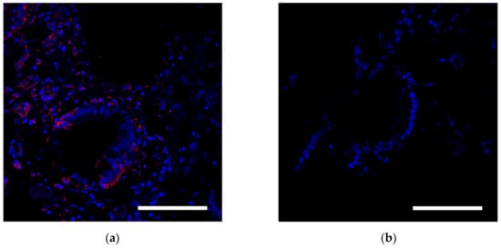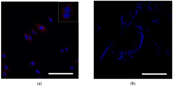 Assessment of SPION internalization with rabbit mesenchymal stem cells. (a,b) Confocal microscopy images of MSCs co-incubated with SPIONs (150 μg/mL) for 24 h and control (non-treated cells), respectively. Nuclei were stained with DAPI (blue). SPIONs were detected by reflected laser scanning (red). Scale bars, 100 µm.