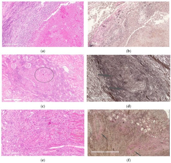 (a,b)—Kidney of the first group rabbit 3 months after the challenge. A large focus of destruction with a developing three-layer wall and a focus of specific infiltration with necrosis in the center (a,b). Staining with hematoxylin and eosin (a), Van Gieson (b). Scale bar, 200 µm (a). Scale bar, 200 µm (b). (c,d)—Kidney of the second group rabbit, which received anti-tubercular chemotherapy within 3 months after the challenge. Focus of specific inflammation with slight necrosis in the center (highlighted circle) and moderately pronounced lymphoid infiltration along the periphery (c); mature connective tissue is absent, initial signs of connective tissue formation (indicated by arrows) (d). Staining with hematoxylin and eosin (c), Van Gieson (d). Scale bar, 200 µm (c). Scale bar, 400 µm (d). (e,f)—Kidney of the third group rabbit, which received MSCs after completion of 3-month anti-tubercular chemotherapy. Granulation tissue with signs of maturation (e), foci of mature connective tissue (indicated by arrows) with accumulations of macrophages in the center of the foci (f). Staining with hematoxylin and eosin (e), Van Gieson (f). Scale bar, 200 µm (e). Scale bar, 200 µm (f).