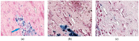 Kidney of the rabbit that received MSCs after completion of 3-month anti-tubercular chemotherapy (one month after MSC transplantation). Accumulation of hemosiderophages (indicated by blue arrow) in the renal parenchyma (a) and cells with Perls-positive inclusions vessels (indicated by white arrow) in the walls of small (b,c). 400×.