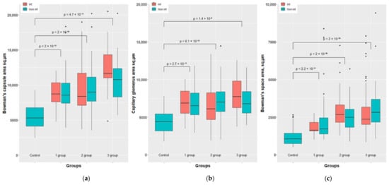 Morphometric results of the rabbit’s kidney of groups 1-3 vs. control. Bowman’s capsule area sq.µm (a). Capillary glomerus area sq.µm (b) and Bowman’s space area sq.µm (c).