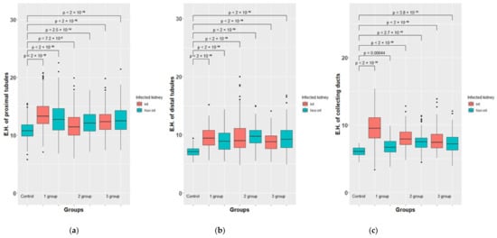 A morphometric study of such indicators as the height of epithelial cells of the proximal and distal convoluted tubules and collecting tubes also revealed statistically significant differences (p > 0.05) between the left infected kidney and the right control, where, according to histological examination, specific inflammatory changes were found as well. It must be assumed that, in contrast to glomerular filtration, the processes of reabsorption in the left and right kidneys, as well as the excretion of urine through the collecting tubules, differed from each other. In this regard, the samples related to the left and right kidneys were considered in a separate way.