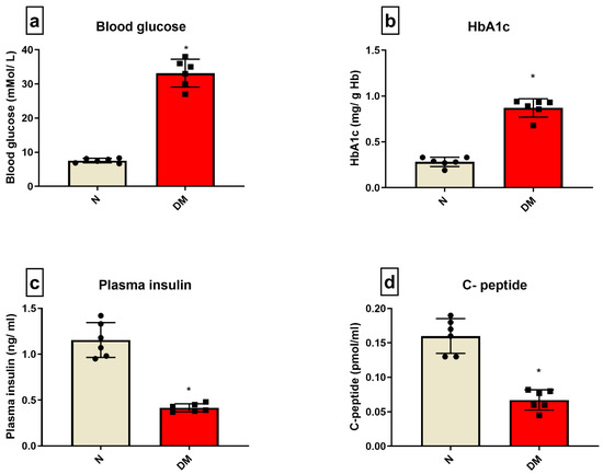 DM characterization: The characteristics of DM were evaluated in the rat blood by assessing the levels of (a) blood glucose; (b) HbA1C; (c) plasma insulin; (d) C-peptide. The graphs represent mean ± SD values. * p < 0.05 vs. N.