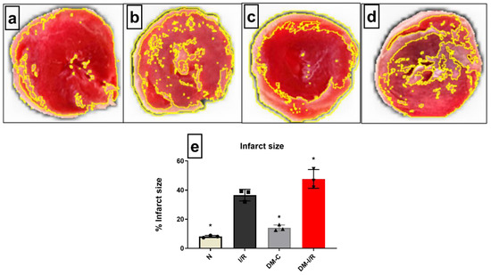 Impact of DM on cardiac I/R injury: The cardiac I/R injury was assessed in DM rat hearts by infarct size measurement of (a) normal; (b) I/R; (c) DM-C and (d) DM-I/R hearts. The presented images are representatives from the groups. (e) represents the infarct size percentage measurement. The graph represent mean ± SD values. * p < 0.05 vs. N.