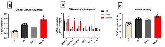 Methylation changes in I/R challenged DM rat hearts: The methylation changes in the DM I/R hearts were assessed from (a) global DNA methylation; (b) the mRNA expression of DNA methylation enzymes DNMT1, 3A, 3B, TET1, 2, 3 (expressed as fold changes from normal); (c) DNMT enzyme activity. The graphs represent mean ± SD values. * p < 0.05 vs. I/R.