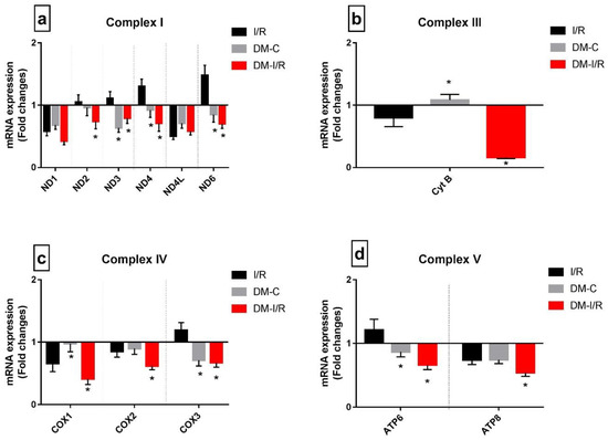 Impact of DM on the expression of mitochondrial-encoded ETC genes during I/R: The mRNA expression of mitochondrial-DNA-encoded genes are presented as fold changes from the normal group for (a) Complex I; (b) Complex III; (c) Complex IV; (d) Complex V. The graphs represent mean ± SD values. * p < 0.05 vs. I/R.