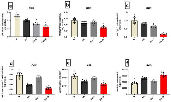 Mitochondrial function assessment in DM hearts post I/R—The effect of I/R on mitochondrial function in DM hearts was assessed by evaluating the enzyme activities of electron transport chain complexes (a) NQR (Complex I); (b) SQR (Complex II); (c) QCR (Complex III); (d) COX (Complex IV); and (e) ATP content; (f) ROS levels. The graphs represent mean ± SD values. * p < 0.05 vs. I/R.