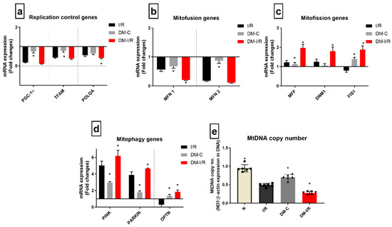 Impact of diabetes on the expression of mitochondrial dynamics genes during I/R: The mRNA expression of mitochondrial regulation control genes are presented as fold changes from the normal group for the processes of (a) mitochondrial replication; (b) mitofusion; (c) mitofission; (d) mitophagy; and the end effector (e) mitochondrial DNA copy number. The graphs represent mean ± SD values. * p < 0.05 vs. I/R.