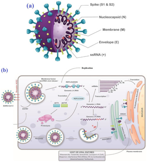 Figure 1. (a) Main parts of SARS-CoV-2, including spike (S1 and S2 subunits), nucleocapsid, membrane, envelope, and ssRNA. (b) Schematic image showing the replication cycle of SARS-CoV-2 in host cells. Distributed under the terms of the Creative Commons Attribution License (CC BY) [26].