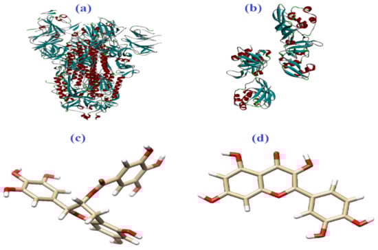 Figure 2. (a) Spike glycoprotein (PDB ID: 6VSB), (b) Nsp15 (PDB ID: 6VWW), (c) epigallocatechin-3-gallate (EGCG), and (d) quercetin.