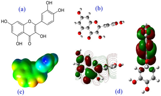 Based on the optimized geometry obtained using GaussView 5.0.8 software, the electric field potentials of EGCG and quercetin were identified as electrophilic and nucleophilic regions by the ground state method, with Hartee-fock at default spin and basis set of 3–21G. As depicted in Figure 8a,b, EGCG is a polyphenol, the ester of epigallocatechin and gallic acid, and is composed of a 22-carbon skeleton bonded by 18 hydrogens and 11 oxygens.