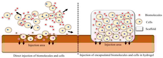 A comparison between direct injection of cells and biomolecules versus injection of cells and biomolecules encapsulated in a hydrogel.