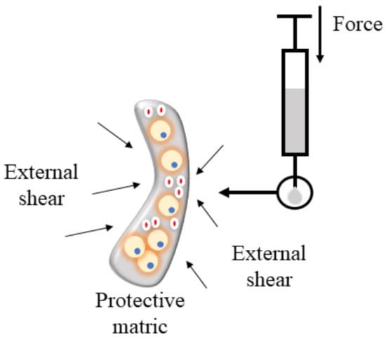Regenerative medicine is the approach of reinstating human cells, tissue or organs to their usual role []. Tissue engineering is application of biomaterial with or without cell transplantation to encourage endogenous regeneration and regain functional tissues or organs []. Fillers such as Teflon, polydimethysilicone and calcium hydroxyapatite are commonly injected into the vocal folds to improve glottal closure but are linked with the risk of inflammation, migration, and granuloma development []. Moreover, current clinical trial research for vocal fold injection focuses primarily on biomaterial alone (ClinicalTrials.gov number: NCT04700566, NCT03790956, NCT02163772) or direct injection of biomolecules or cells (ClinicalTrials.gov number: NCT05354544, NCT05385159, NCT03749863, NCT02622464, NCT02120781, NCT02904824, NCT04839276). It is suggested that combining biomaterials with biomolecules such as growth factors can improve the efficacy []. The combination of biomolecules, cells, and a scaffold serves as a unique delivery system. As cells proliferate to generate new tissue, biomolecules promote the growth of new tissue, and the scaffold serves as an environment for the regeneration of new tissue [,]. The comparison between injection of cells and biomolecules without and with a scaffold is shown in Figure 3.