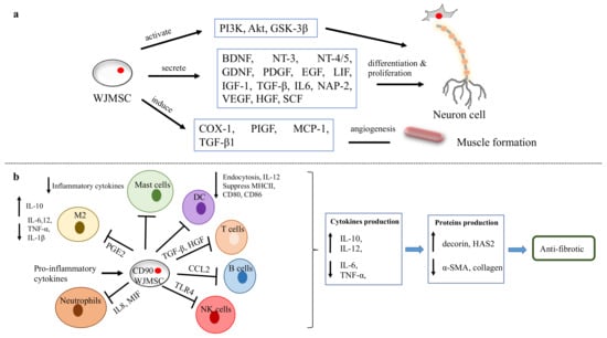 WJMSC functions. (a) The function of WJMSCs in neuronal and muscular regeneration. (b) Immunomodulatory properties of WJMSCs in preventing fibrosis.