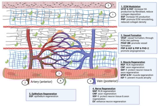 Gene therapy aims to transmit genetic material, such as deoxyribonucleic acid (DNA) or ribonucleic acid (RNA), in order to modify the genetic outcome []. Nonetheless, gene therapy has created safety concerns, as it may generate negative side effects such as inflammatory reactions []. A study sought to increase the effectiveness of silencing prolyl hydroxylase domain-containing protein 2 (PHD2) by delivering siRNA through biodegradable biomaterial, to regulate the inflammatory response of the host and promote angiogenesis upon implantation of biomaterials []. PHD2 is one of the essential genes that affect endothelial cell inflammatory properties. By silencing PHD2, it is possible to reduce over-inflammation, which has applications in acute inflammatory diseases []. By incorporating biomaterial application into gene therapy, the biomaterial can delay the release of gene materials through progressive degradation and reduce the risk of inflammation [,]. Figure 8 indicates the overall regenerative capacity of biomolecules in the vocal fold.