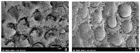 MIHs specimens’ SEM photographs (5000×). (a) Group E—yellow hypomineralized opacities; (b) Group H—yellow hypomineralized opacities after CPP-ACP protocol.