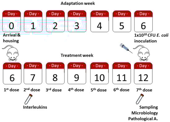 Timeline of the study. Animals were housed and identified on day 0. After 6 days of adaptation to the animal facility, E. coli inoculation and first treatment dose were administered; 24 h after, blood samples for interleukin determination were obtained. On day 12, animals were sacrificed by lethal doses of anesthesia, sampled for microbiological analysis (blood and peritoneal fluid) and pathological anatomy (liver and peritoneum).