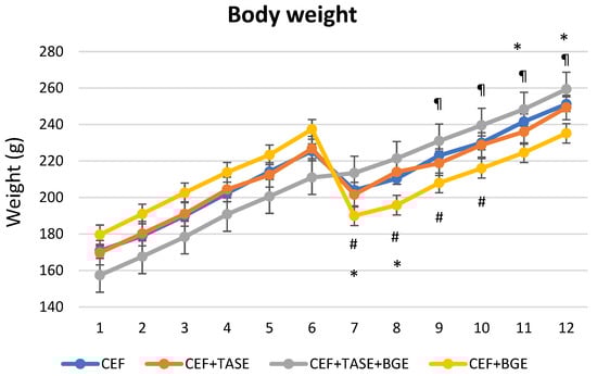 Weight monitoring during experiment (12 days). On day 6, the bacterial inoculum was introduced. CEF = ceftriaxone (* p < 0.05). CEF + TASE = ceftriaxone + thiosulfinate-enriched Allium sativum extract. CEF + TASE + BGE = ceftriaxone + thiosulfinate-enriched extract + black garlic extract (¶ p < 0.05). CEF + BGE = ceftriaxone + black garlic extract (# p < 0.05). Mean ± SEM.