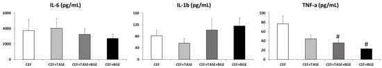 In relation to the biochemical parameters studied (IL-1, IL-6, and TNF-α), a comparison was made for the values of each interleukin between treated groups in T2 (Figure 3). Considering the levels of IL-1 and IL-6, no differences between groups were assessed. As for TNF-α, we found statistically significant differences when comparing group CEF + TASE + BGE and group CEF + BGE with respect to group CEF and group CEF + TASE, as they both showed lower levels of TNF-α expression (p < 0.05).
