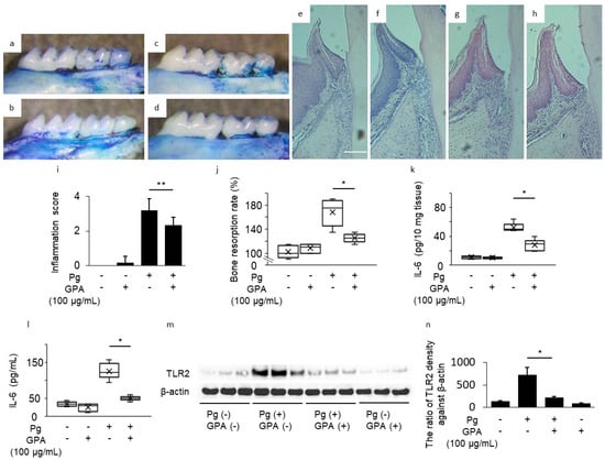 To assess the effect of GPA in vivo, we examined experimental periodontal disease in mice inoculated with P. gingivalis and control or GPA-treated gingival tissue, serum, and alveolar bone. Resorption of alveolar bone was increased in the Pg group compared to the control group; however, this increase was inhibited by oral administration of GPA in the Pg/GPA group (40% suppression, Figure 2a–d,j). Histological observations showed the same trend. The Pg group showed resorption in the alveolar bone and increased infiltration of inflammatory cells in the connective tissue compared to those in the control group (Figure 2e,g,i). However, GPA inhibited Pg-induced inflammation in the periodontal tissue (Pg/GPA group, Figure 2h,i). IL-6 levels in the gingival tissue and serum were elevated in the Pg group compared to those in the control group. This elevation was suppressed by oral administration of GPA to the Pg/GPA group (Figure 2k: gingival tissue, 39.4% suppression; Figure 2l: serum, 57.9% suppression). Single GPA addition had no effect compared to the control group. To clarify the target molecule of GPA in the gingival tissue, the protein level of TLR2 was determined using Western blotting. The increased TLR2 level in the Pg group was suppressed by oral administration of GPA in the Pg/GPA group (Figure 2m,n). These results show that orally administered GPA acts as an anti-inflammatory agent in periodontitis.