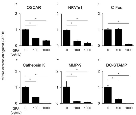Inhibitory effect of geniposidic acid (GPA) on mRNA induction of osteoclast differentiation-related genes. To determine the effect of GPA in osteoclast differentiation, BMMCs were cultured with sRANKL (100 ng/mL) and M-CSF (20 ng/mL) for 48 h in the presence or absence of GPA (100 or 1000 μg/mL). mRNA expression was determined using quantitative PCR ((a): OSCAR, (b): NFATc1, (c): c-Fos, (d): cathepsin K, (e): MMP-9, and (f): DC-STAMP). * Significantly higher mRNA expression of genes by Student’s t-test (* p < 0.01).