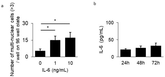 Effect of IL-6 on osteoclast differentiation. (a) Osteoclast differentiation assay was performed in the presence of sRANKL (100 ng/mL), M-CSF (20 ng/mL), and IL-6 (0, 1, 10 ng/mL) for 7 days. Osteoclasts with multiple nuclei (>3) in 96-well plates were counted after TRAP-staining. (b) IL-6 production in the supernatant of BMMCs in the presence of sRANKL (100 ng/mL) and M-CSF (20 ng/mL) after 24, 48, and 72 h was measured using ELISA. The data represent the results of three independent experiments. * Significantly larger number of osteoclasts by Student’s t-test (* p < 0.01).