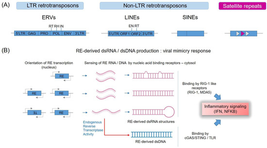 Regarding immune signaling, it has become evident that once exported to the cytoplasm, RE-derived RNA (or indeed DNA, produced consequently to endogenous retrotranscriptase activity) can directly trigger innate immune receptor signaling and inflammatory responses through the presence in RE sequences of pathogen-associated features that are more typically found in immunostimulatory viral RNA and DNA [34,35] (Figure 2).