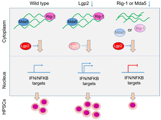 By formulating the hypothesis that self-RNA derived from TE might trigger RIG1 receptor activation, Trompouki and colleagues investigated the involvement of RIG-I-like receptors (RLRs) in HSPC formation [9]. By using a zebrafish model, the investigators showed that Rig-I or Mda5 deficiency impaired and Lgp2 deficiency (negative regulator of Rig-I and Mda5) enhanced HSPC emergence in zebrafish embryos. This was related to inflammatory signaling that was reduced in Rig-I- or Mda5-deficient conditions and enhanced in Lgp2-deficient embryos [9]. Simultaneous reduction of Lgp2 and either Rig-I or Mda5 rescued inflammatory signals and HSPC numbers [9] (Figure 3).