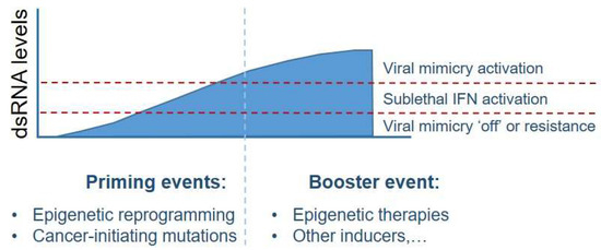 Viral mimicry induces immunogenic cell death in a dsRNA dose-dependent manner. The tolerance threshold for induction of lethal IFN responses in response to dsRNA differs in a cell context-dependent manner. Cancer-initiating mutations or epigenetic malfunctions or drug-induced epigenetic reprogramming act as ‘priming events’ that activate repeat elements and elevation cytosolic dsRNA levels. This increases cancer cell sensitivity to ‘booster events’ that further derepress dsRNAs beyond dsRNA tolerance thresholds. In this setting, cancers with elevated baseline dsRNA levels can be viewed as ‘primed’ for viral mimicry induction. Certain cancers (such as acute myeloid leukemia) have evolved mechanisms to suppress the viral mimicry response and can be referred to as ‘resistant’. Understanding such resistance mechanisms is required to derive new therapeutic strategies for engagement of the viral mimicry response (figure adapted from the review by Chen and colleagues [3]).