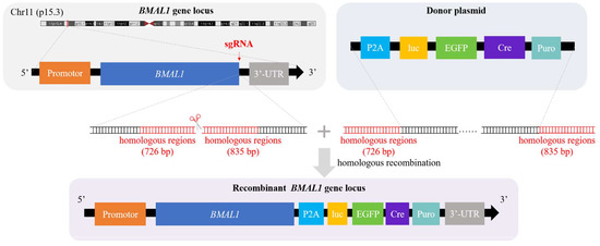The following supporting information can be downloaded at: https://www.mdpi.com/article/10.3390/biomedicines10123108/s1, S1: Left homologous arm sequence of BMAL1. S2: Right homologous arm sequence of BMAL1. S3: The DNA sequence of P2A-EGFP-CRE-Puro cassette from Addgene (#67503).