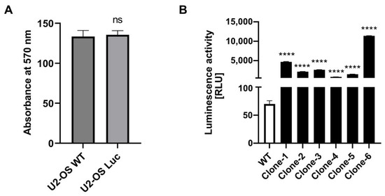 The phenotype of U2-OS stable cell line. (A) Cell viability was detected in wild-type U2-OS and U2-OS-Luc cell lines with six replicates by Prestoblue Assay (n = 3). ns., not significant, Student′s t-test. Data are presented as mean ± SEM. (B) The luciferase activity of isolated U2-OS-Luc single clones. **** p < 0.0001 compared to WT U2-OS cell, Student’s t-test.