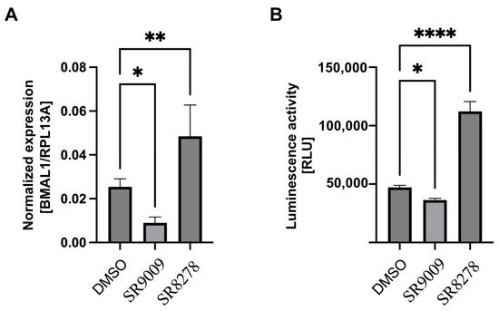 Validation of the BMAL1 promoter–promoter-driven luciferase reporter system in U2-OS-Luc cell line. (A) Relative mRNA levels of BMAL1 gene in U2-OS-Luc cells treated with BMAL1 activator SR9009 and inhibitor SR8278 (n = 3). * p < 0.05 and ** p < 0.01 compared to DMSO control, Student′s t-test. (B) The luciferase activity in U2-OS-Luc cells treated with BMAL1 activator and inhibitor (n = 3). * p < 0.05, ** p < 0.01 and **** p < 0.0001 compared to DMSO control, Student’s t-test.