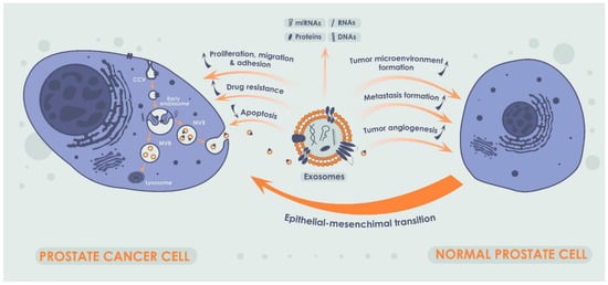 Exosomes are small EVs secreted by both normal and cancer cells. Exosomes are found in almost all types of cells and were successfully isolated from blood, urine, semen, and other body fluids [60]. Exosomes are released into the extracellular space via exocytosis and may carry different contents, such as proteins and different types of RNA and DNA, and function as intercellular messengers transmitting signaling molecules from one cell to another [61] (Figure 3). A large body of evidence suggests a critical role of the exosomes in tumor progression and metastasis. Another important feature of the exosomes is formation of drug resistance by inducing a tumor-friendly microenvironment due to involvement of the exosomes in proliferation, differentiation, and migration of fibroblasts, influence on immune cells, and stimulation of tumor angiogenesis. In its turn, exosomal miRNAs are of particular interest due to their ability to affect cancer progression by reducing apoptosis in a tumor and by increasing proliferation, migration, and adhesion of cancer cells [62,63,64]. At the same time, one of the main factors indicating the critical role of exosomal miRNAs in PCa carcinogenesis is their role in the regulation of epithelial–mesenchymal transition of PCa cells [65].