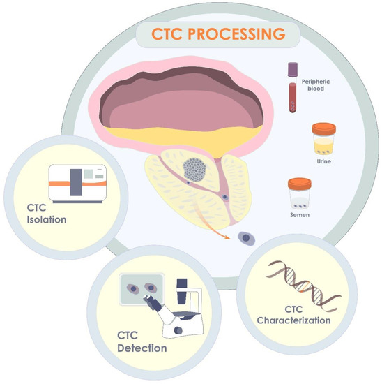 CTCs in localized form of PCa. Originating in primary tumor, CTCs may release into blood, semen, or urine. Thus, being isolated from one of the biological fluids, CTCs may be further detected and quantified, or characterized via molecular analysis, including gene analysis.