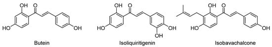 Butein (3,4,2′,4′-tetrahydroxychalcone) is a naturally occurring chalcone, isolated from Rhus verniciflua stokes [], with well-known anti-inflammatory, pain-relieving, anti-emetic, antioxidant, and anti-bacterial properties [] in addition to marked anticancer activity []. Indeed, butein induces reactive oxygen species (ROS) generation and apoptosis [], attenuates angiogenesis [], controls cell invasion/metastasis, and reduces inflammation by inhibiting the nuclear factor-kappa B (NF-κB) signal pathway [,]. Moreover, in HCC, butein causes G2/M phase cell cycle arrest []. In addition to butein, isoliquiritigenin (isolated from licorice roots) and isobavachalcone (predominantly found in species of the Fabaceae and Moraceae families) (Figure 1) are two other natural chalcones with noticeable antitumor activity against various cancers [].