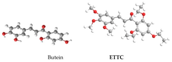 Furthermore, conformational analysis of ETTC revealed that the insertion of ethoxy substituents in both ortho-positions gave rise to significant effects on its three-dimensional structure. In fact, in constrast to butein and most chalcone derivatives, which are fully planar, in chalcone ETTC, the benzoyl ring is almost orthogonal with respect to the plane of the enone moiety, due to steric repulsions between the two ortho-ethoxy substituents and the carbonyl. In Figure 2, the 3D structure of totally planar butein is compared with that of ETTC.