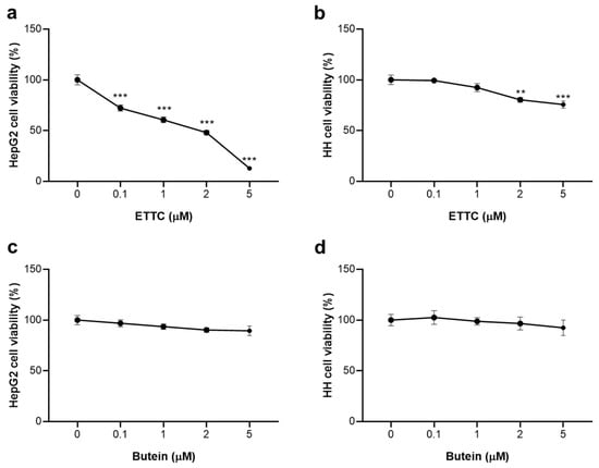 Effects of ETTC and butein on viability of HepG2 and HH cells. HepG2 and HH cells were treated with vehicle DMSO (0) or ETTC (a,b) or butein (c,d) at the indicated concentrations (0.1, 1, 2, and 5 µM). Cell viability was assessed after 72 h exposure. Data are expressed as mean values ± SD of three separate experiments and were analyzed by one-way ANOVA followed by Tukey’s post-hoc test. Where indicated, differences were significant (** p < 0.01, *** p < 0.001 vs. control (0)).