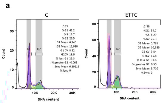 For cell cycle analysis, we adapted the procedure described in []. Briefly, HepG2 cells were seeded in a 6-well culture plate (2 × 106 cells/well) and treated with 2 µM ETTC or an equal volume of DMSO (used as solvent). After 48 h, cells were collected, washed twice with cold PBS, fixed in EtOH 70% at −20 °C, and treated with 100 µg/mL RNase A. Finally, 50 µg/mL propidium iodide was added and the mixture was incubated for 30 min at room temperature. DNA content was detected using an Attune Nxt Acoustic Focusing Cytometer (Thermo Fisher Scientific, Waltham, MA, USA) equipped with a blue laser (488 nm). The percentage of cells in the subG1 phase, G1 phase, the S phase, and the G2 phase was analyzed using FlowJo™ 10.4 Software.