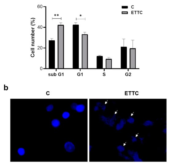 Effect of ETTC on cell cycle progression and nuclear morphology of HepG2 cells. (a) HepG2 were treated with ETTC and analyzed by flow cytometry after 48 h. The graph containing the percentage ± SD of cells in each phase of the cell cycle (G1:blue; S: yellow; G2: green; pink line represents the optimal histogram deduced by the FlowJo Cell Cycle Analysis algorithm) was obtained from three independent experiments. Statistical analysis was performed by Student’s t-test. Where indicated, differences were significant (* p < 0.05, ** p < 0.01). (b) Following 24 h treatment with DMSO (C) or ETTC, HepG2 cells were stained with DAPI and visualized under a fluorescence microscope (magnification 20×). Arrows indicate condensed nuclei of ETTC-treated HepG2 cells.