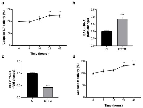 ETTC activates the intrinsic pathway of apoptosis. (a) HepG2 cells were treated with DMSO (0) or ETTC for 8–16–24–48 h and assayed for caspase 3/7 activity. mRNA levels of BAX (b) and BCL-2 (c) were evaluated after 24 h treatment with ETTC. (d) Cells were treated as in (a) and the activity of caspase 9 was measured. In (a–d), mean values ± SD of three independent experiments performed in triplicate are shown, where indicated differences between samples and relative controls are significant (** p < 0.01, *** p < 0.001, one-way ANOVA followed by Tukey test (a,d) and Student’s t-test (b,c)).