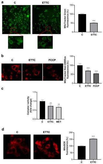 ETTC caused mitochondrial alterations. HepG2 cells, exposed to 2 μM ETTC or DMSO (c), were stained with MitoTracker Green FM (a), MitoTracker™ Red CMXRos (b), and MitoSOX Red Mitochondrial Superoxide Indicator (d). In (b), cells were also treated with 2 μM FCCP. Images were acquired under fluorescence microscope (magnification 20× in upper panel of (a), magnification 40× in lower panel of (a,b,d)). Images and relative bar graphs are representative of three independent experiments with similar results. (c) The activity of the Complex I was measured in isolated mitochondria from HepG2 cells treated as above (a,b,d) or with 2 μM Metformin (MET). The activity of Complex I was normalized against the activity of citrate synthase. The fold change was the ratio of enzyme activity from cells exposed to ETTC or Metformin with the activity relative to control. The data are representative of three independent experiments, and the bars are presented as means ± SD. (** p < 0.01, *** p < 0.001).