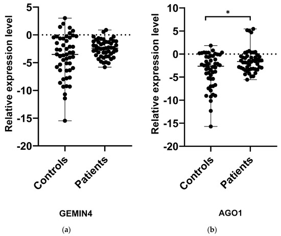 Expression levels of GEMIN4 (a) and AGO1 (b) in PBMCs from MS patients and healthy controls. Statistical analysis of differences between the groups of data was carried out using the Mann–Whitney U-test (* indicate statistical significance at a p < 0.05).