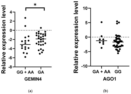 Comparison of the expression level of GEMIN4 rs7813 (a) and AGO1 rs636832 (b) genetic variants in the group of patients with MS. Statistical analysis of differences between the groups of data was carried out using the Mann–Whitney U-test (* indicate statistical significance at a p < 0.05).