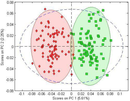 The PCA separated the BPC 157-treated and control samples on a PCA score–score graph. Using 100 spectra of both BPC-treated and control samples, the PCA model showed the scatterplot of the first two principal components, with a clear distinction, mostly due to the PC1 score, between the spectra of the BPC 157-treated group (green) and those of the control group (red) (Figure 1).