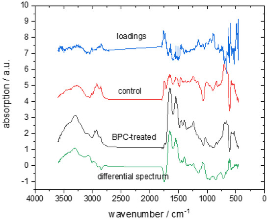 The PC1 loadings and the differential spectrum showed that the main bands affecting the separation of the BPC-treated and control sample spectra were the amid I band around 1650 cm−1, the amid II band around 1540 cm−1, and the vibrational band around 1744 cm−1. There was also a small but observable difference in intensity in the spectral range of the CH vibrations of lipids between 2800 and 3000 cm−1. Table 1 lists the assignments of vibrational bands relevant to this paper.