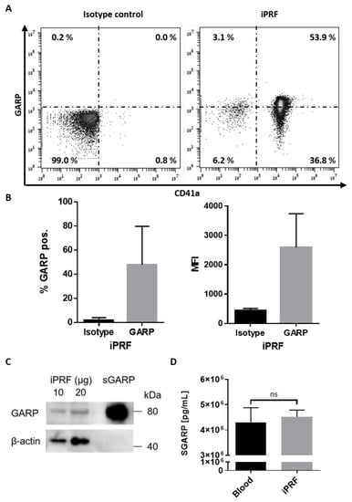 GARP was first characterized to be expressed on the surface of platelets, and activated platelets are known to upregulate GARP expression on their surfaces [20]. However, up until now, no study has shown that GARP is expressed in autologous platelet concentrates. Here, it was demonstrated for the first time that GARP is expressed on the surface of platelets found in freshly generated iPRF. By flow cytometric analysis, it was determined that approximately half the platelets expressed GARP on their surfaces, and the expression of GARP was highly elevated in comparison to the isotype control (Figure 1A,B). Previous work, using pre-activated platelets, showed comparable percentages of GARP+ platelets and GARP expression levels [24]. This suggests that part of the platelets found in iPRF could be partially activated, presumably resulting from their preparation process, but this should be validated in future studies.