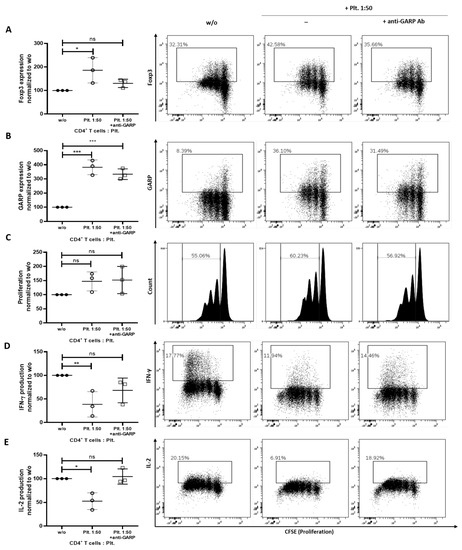 Isolated platelets from liquid platelet rich fibrin (iPRF) induce a regulatory phenotype in CD4+ T cells. CD4+ T cells and platelets (Plt.) were cocultured at a ratio of 1 to 50 and were treated with 10 µg/mL anti-GARP antibody (Ab). CD4+ T cells were prelabled with carboxyfluorescein succinimidyl ester (CFSE) to track their proliferation and stimulated with 0.5 µg/mL anti-CD3 and 1.0 µg/mL anti-CD28 Abs in the presence or absence of platelets. (A–C) The expression of Foxp3 (A), GARP (B), and proliferation (C) of CD4+ T cells was measured on day 3 of coincubation via flow cytometry. (D,E) After 6 days of coincubation, cells were stimulated with phorbol 12-myristate 13-acetate (PMA), ionomycin, and monesin for 5 h. IL-2 and IFN-γ production was quantified via intracellular flow cytometry. Representative dot plots of three independent experiments are shown. Graphs show CD4+ T cells cocultured with platelets normalized to untreated CD4+ T cells alone control (n = 3, means ± SD, * p < 0.05, ** p < 0.01, *** p < 0.001, and ns determined by one-way ANOVA).